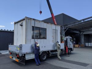 プレハブの搬送は、日頃お世話になっている中国物流さんのユニック車で運搬をお願いしました。