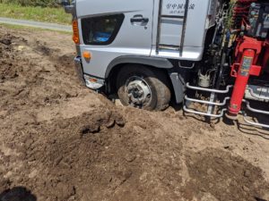 トラックが柔らかい土にタイヤがはまり抜けられない!